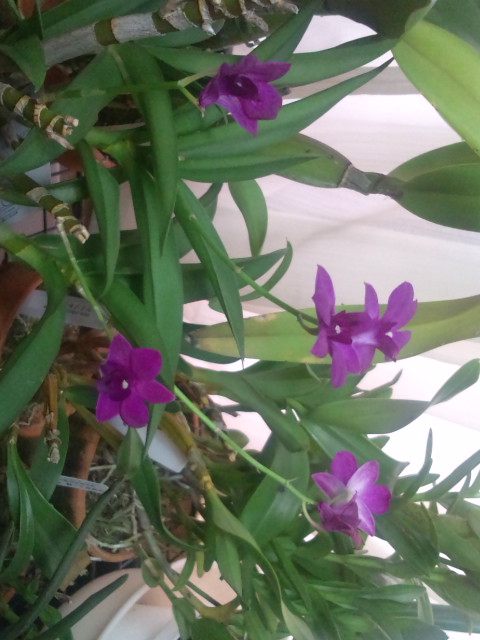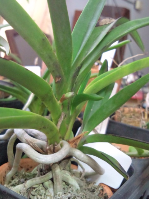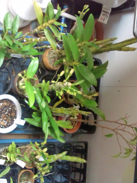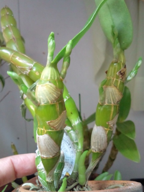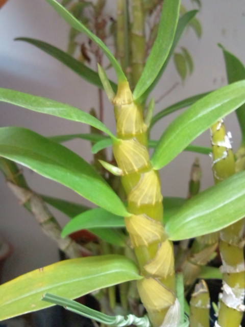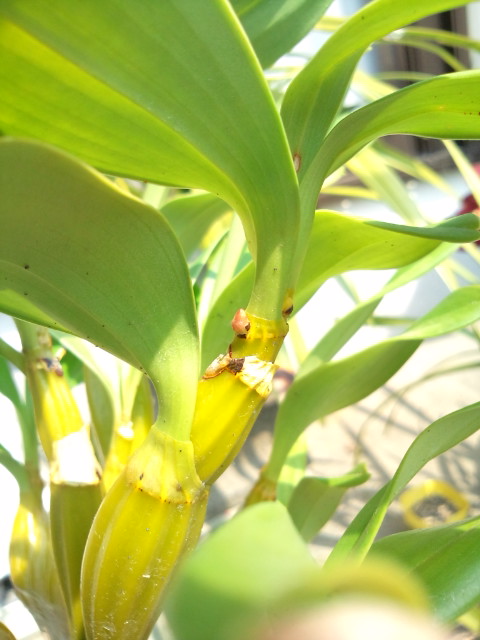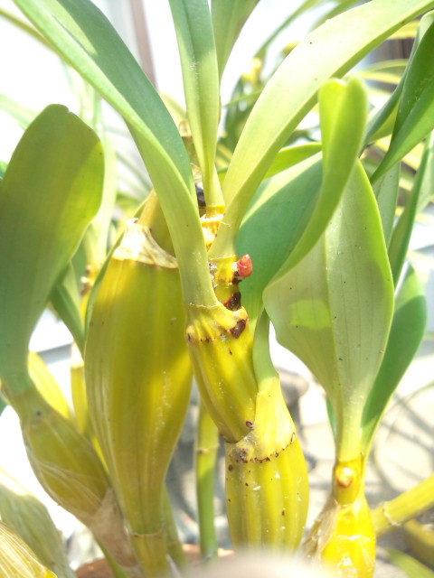 セッコクの血が強いのか、イエロー系の品質か、バックバルブ咲きに細めのバルブです。